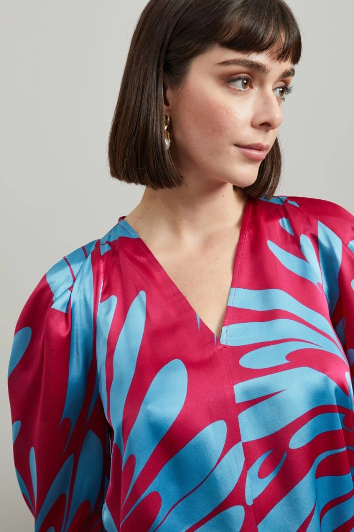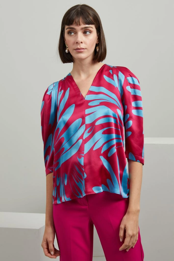 Casacca dalla linea fluida realizzata in raso di pura seta stampata, con scollo a V e maniche tre quarti a sbuffo.