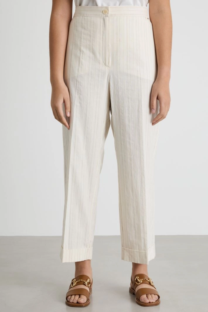 Pantalone dalla linea ampia in lino e cotone jacquard, con inserto elastico in vita sul retro, tasche alla francese sul davanti, risvolto al fondo. Chiusura con bottone e zip nascosta.