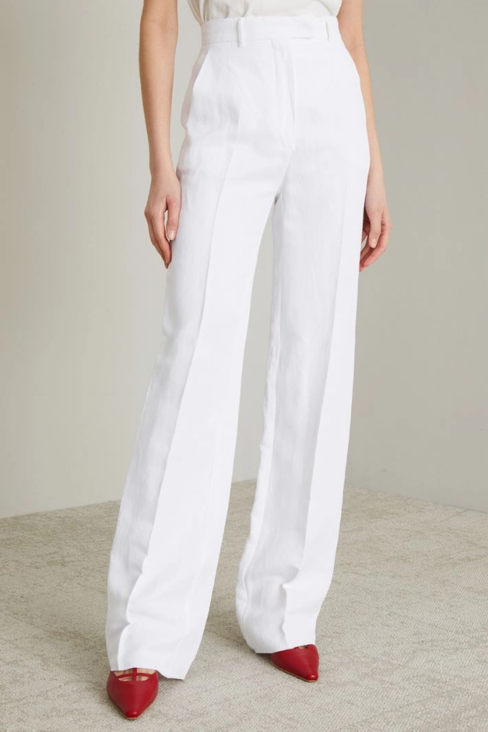 Pantaloni a palazzo realizzati in batavia di puro lino, con passanti in vita, tasche alla francese sul davanti, piega stirata. Allacciatura nascosta tramite zip, bottone e gancio.