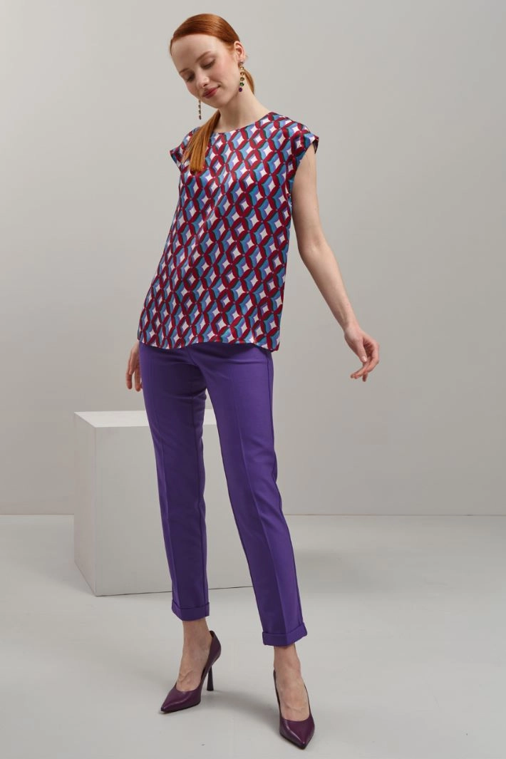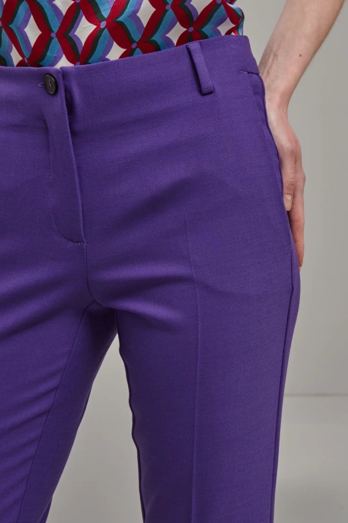 Pantaloni a sigaretta realizzati in tessuto diagonale di misto viscosa stretch, con passanti in vita, tasche laterali alla francese sul davanti e a doppio filetto sul retro. Orlo con risvolto a fondo capo, allacciatura tramite zip nascosta e bottone.