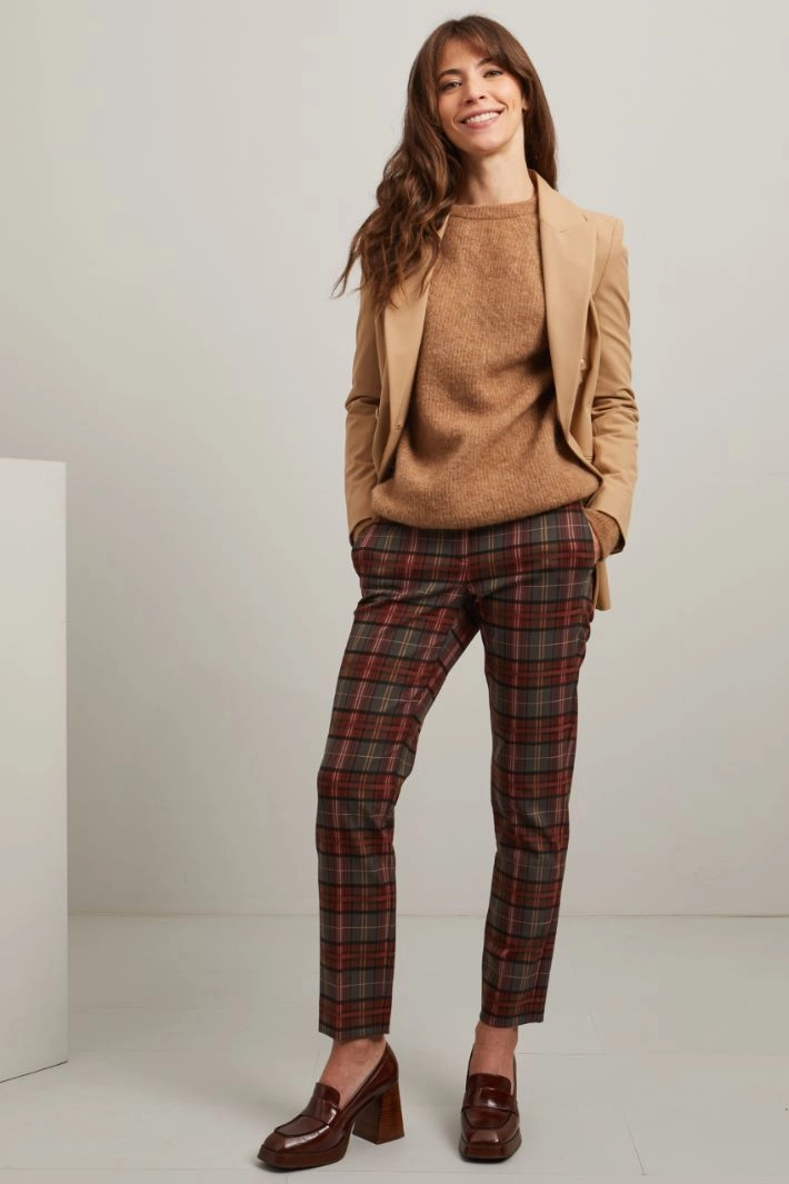 Pantaloni chino realizzati in tessuto diagonale di misto lana stretch, passanti in vita, tasche alla francese sul davanti e a filetto dietro. Allacciatura tramite zip nascosta e bottone.