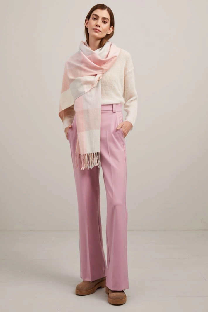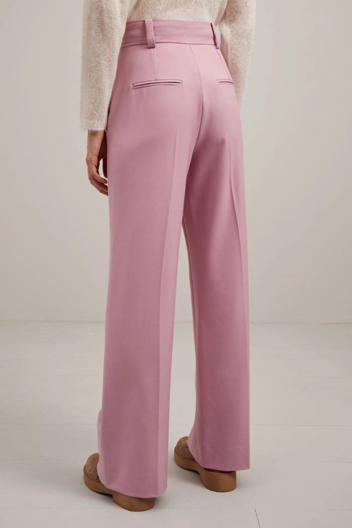 Pantaloni dalla linea a palazzo realizzati in cady stretch, con passanti in vita, tasche laterali alla francese, piega stirata e allacciatura nascosta tramite zip, bottone e gancio.