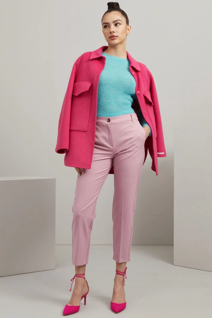 Pantaloni dalla linea dritta realizzati in tessuto diagonale di misto viscosa stretch, con cintone, inserto elastico e passanti in vita, tasche laterali inserite in cucitura, piega stirata e allacciatura tramite zip nascosta e bottone.