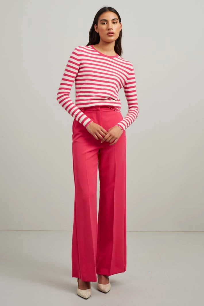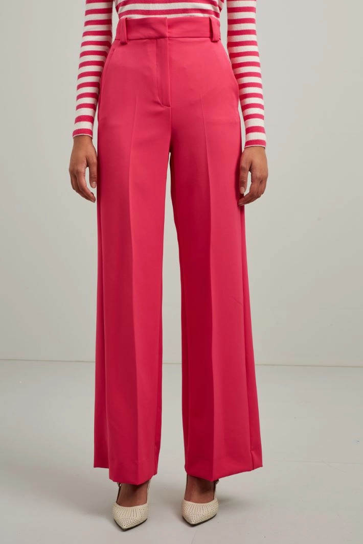 Pantaloni dalla linea a palazzo realizzati in cady stretch, con passanti in vita, tasche laterali alla francese, piega stirata e allacciatura nascosta tramite zip, bottone e gancio.