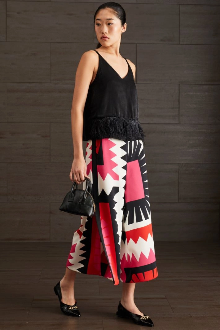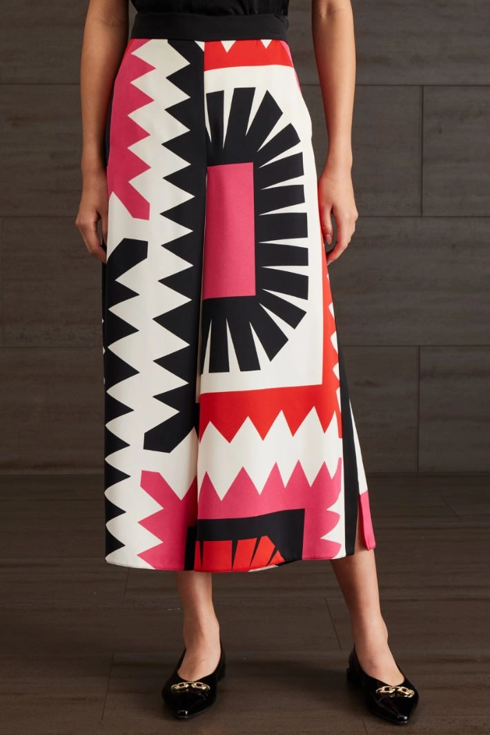 Pantaloni dalla linea svasata realizzati in enver satin stampato, con cintone in vita, tasche alla francese e maxi spacchi. Allacciatura tramite zip invisibile sul retro.