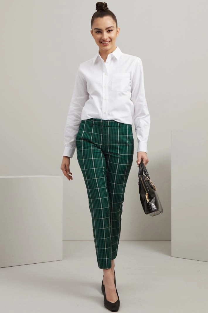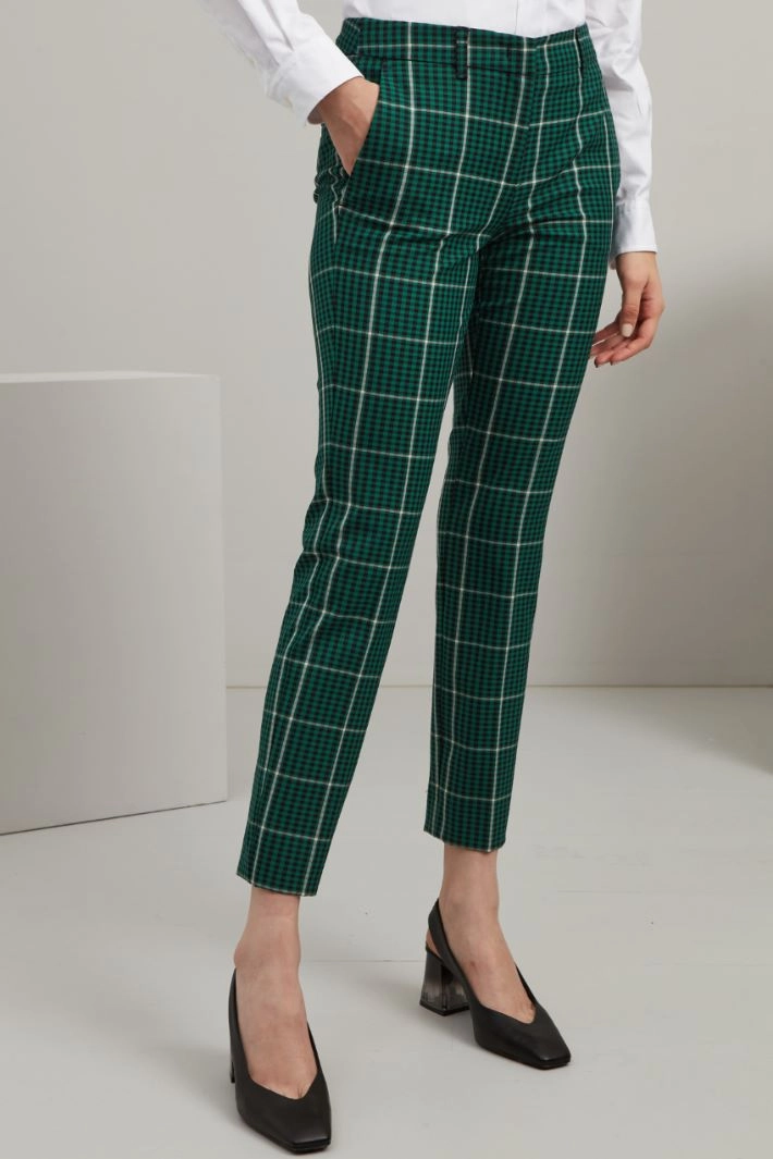 Pantaloni dalla linea dritta realizzati in tessuto diagonale stretch, con passanti in vita, tasche alla francese sul davanti e a filetto nel retro. Allacciatura nascosta tramite zip, bottone e gancio.