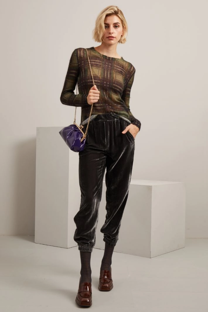 Pantaloni jogger realizzati in ciniglia di viscosa, con inserto elastico in vita e al fondo, tasche alla francese davanti e filetto nel retro.