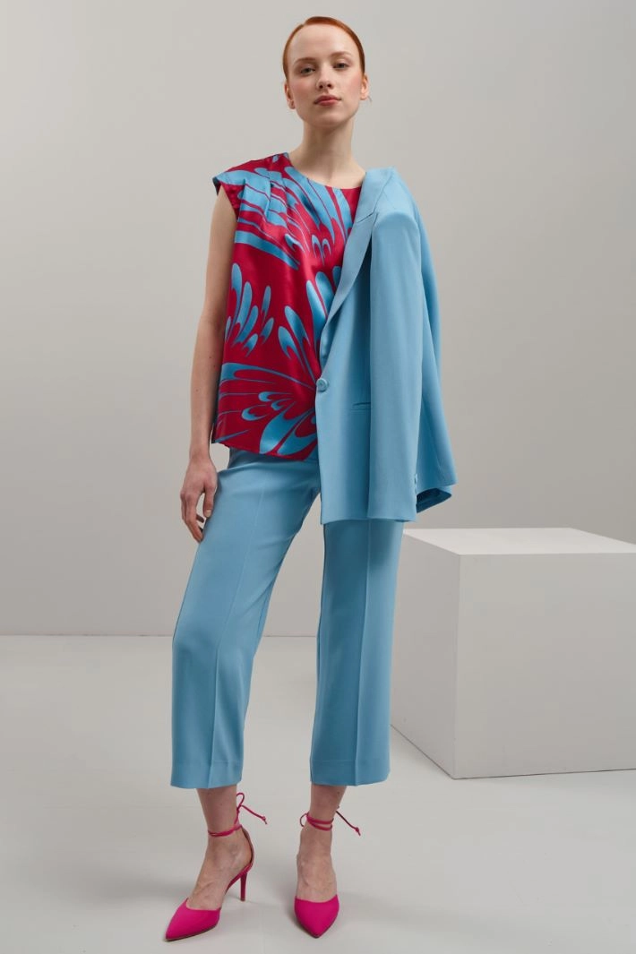 Pantaloni cropped dalla linea dritta realizzati in enver satin, con cintone in vita, tasche alla francese sul davanti e a filetto nel retro, piega stirata, allacciatura nascosta tramite zip, bottone e gancio.