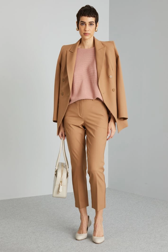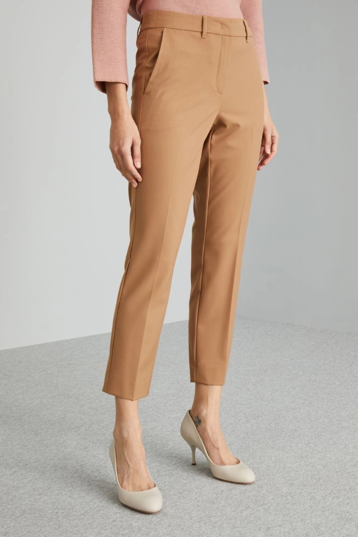Pantaloni a sigaretta realizzati in tela di misto viscosa stretch, con passanti in vita, tasche laterali alla francese e a doppio filetto nel retro, allacciatura nascosta tramite zip, bottone e gancio.