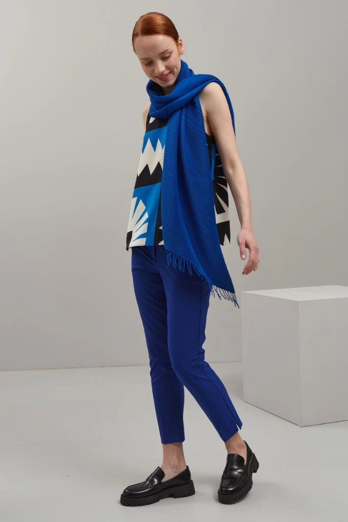 Top smanicato dalla linea morbida realizzato in enver satin stampato con scollo all'americana e spacchetti al fondo. Allacciatura tramite zip invisibile sul retro.