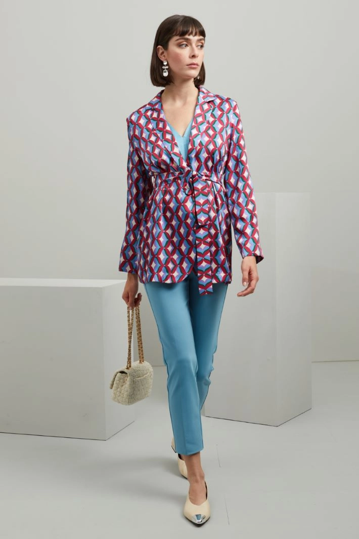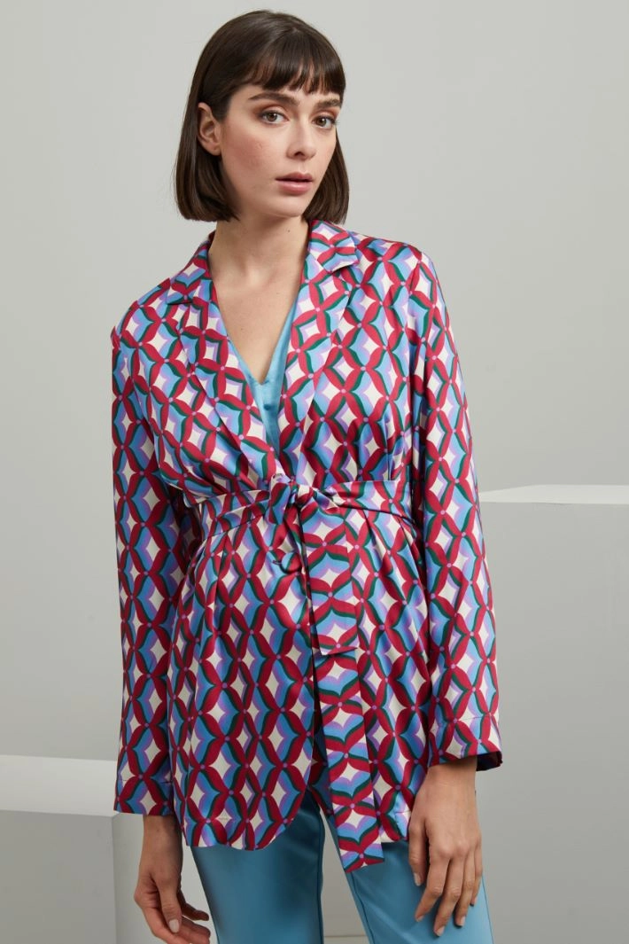 Casacca dalla linea fluida realizzata in twill stampato, con collo a rever, maniche lunghe, cintura coordinata da annodare in vita e allacciatura monopetto tramite bottone singolo. Sfoderata.