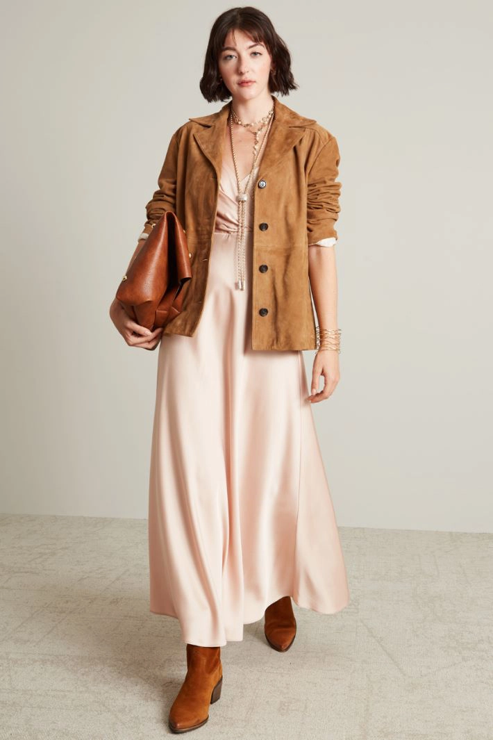 Abito lungo dalla linea svasata realizzati in raso con scollo a V, spalline sottili, motivo arricciato sul petto con taglio in vita e allacciatura tramite zip invisibile sul dietro.