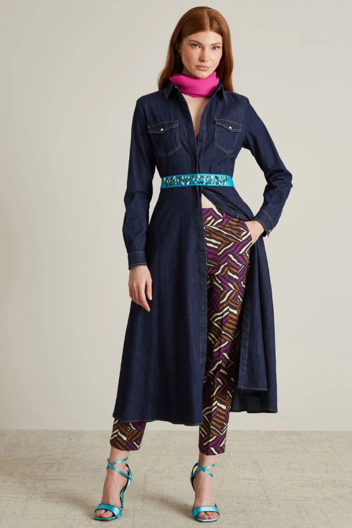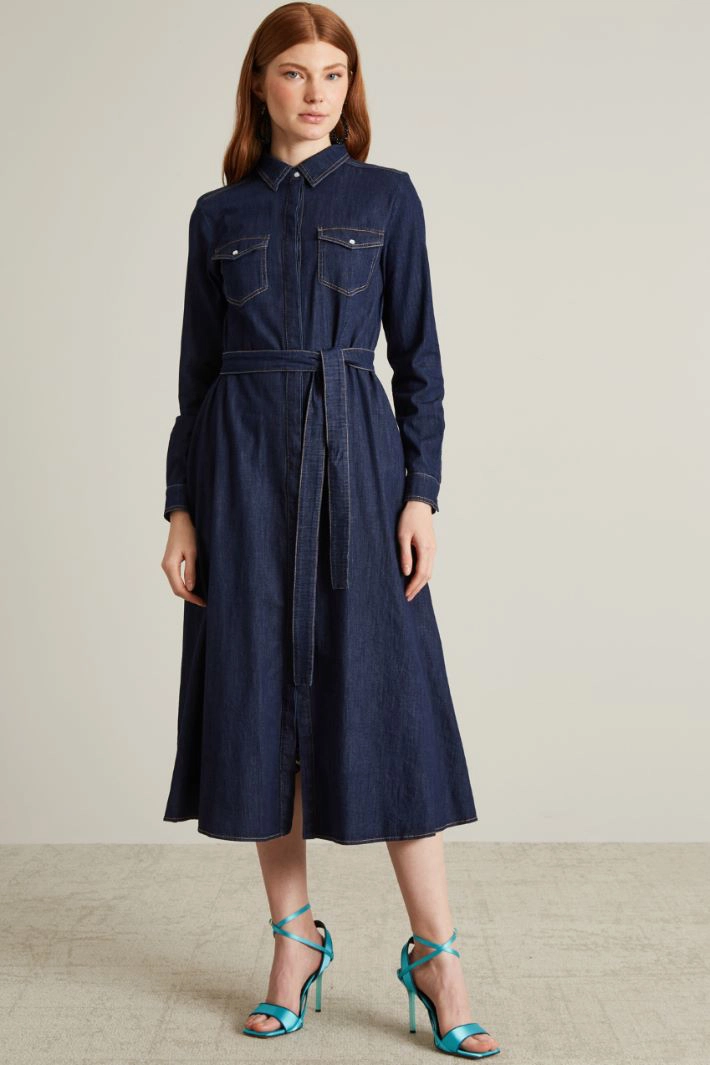 Abito lungo, stile chemisier, dalla linea svasata realizzata in denim di cotone stretch, con collo a camicia e scollo a polo, maniche lunghe con polsini e bottoni, tasche applicate con patta e bottone sul petto e motivo di taglio in vita elasticizzato sul dietro. Cintura coordinata in abbinamento e allacciatura tramite bottoni nascosti.