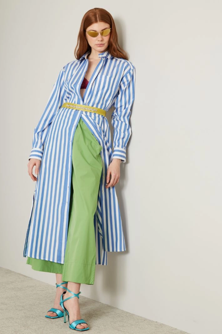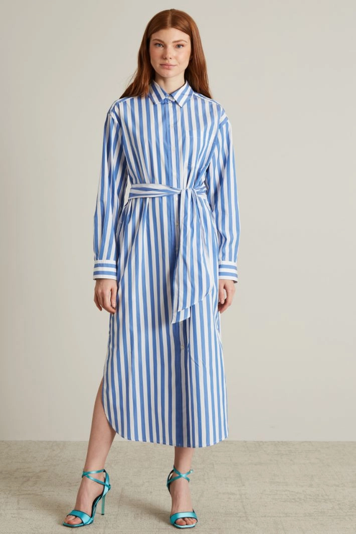 Abito chemisier dalla linea svasata realizzato in popeline a righe di puro cotone tinto filo, con colletto classico, maniche lunghe con polsino e bottone, taschino al petto e laterali inserite in cucitura, spacchi laterali. Modello con taglio carrè e cannoncino sul retro, allacciatura tramite bottoni e fusciacca coordinata in abbinamento.