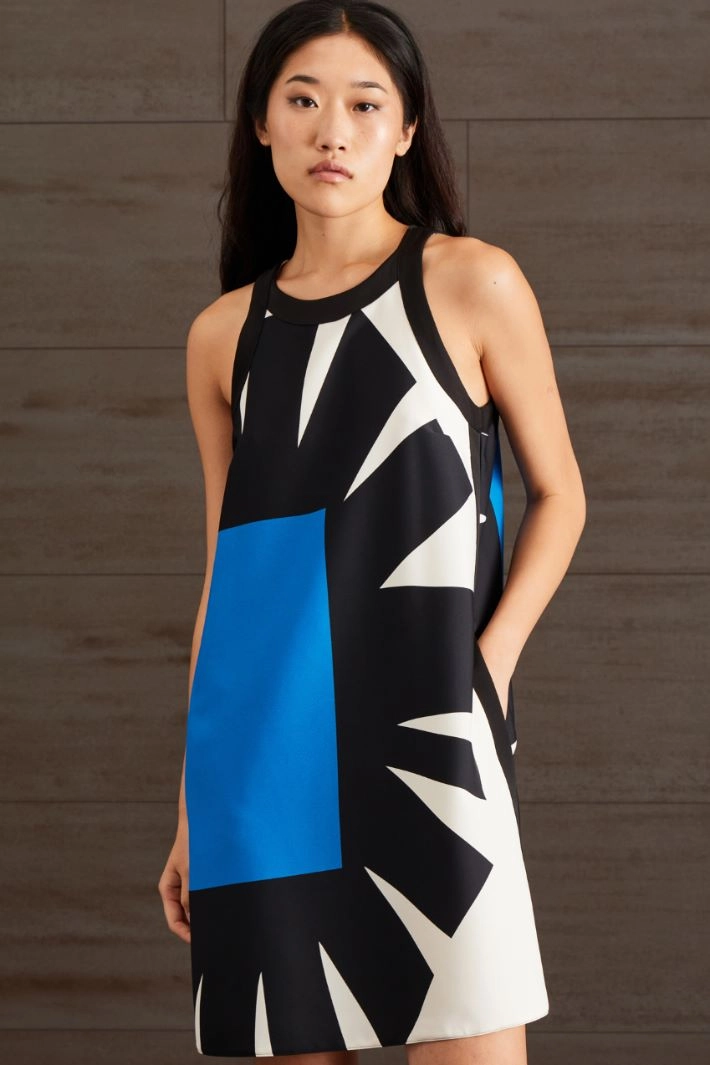 Abito smanicato dalla linea svasata realizzato in enver satin stampato con scollo all'americana e tasche inserite in cucitura. Allacciatura tramite zip invisibile sul retro. Sfoderato.