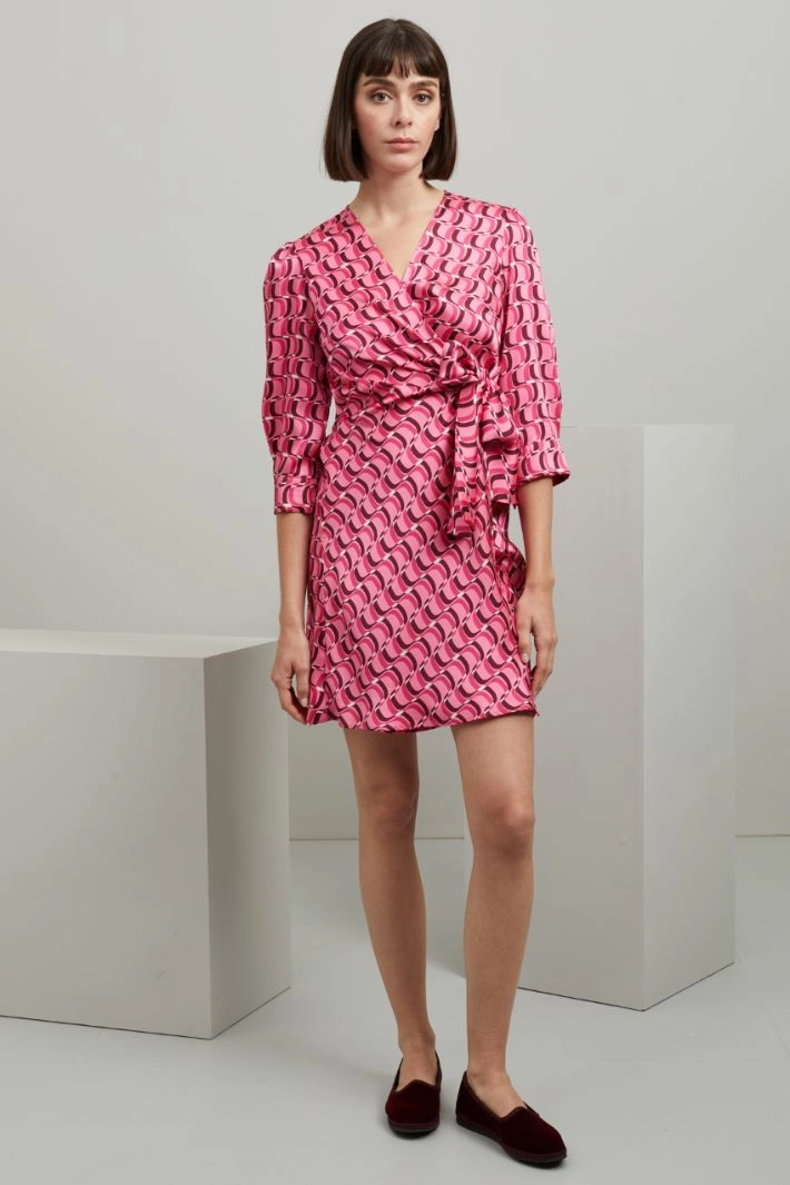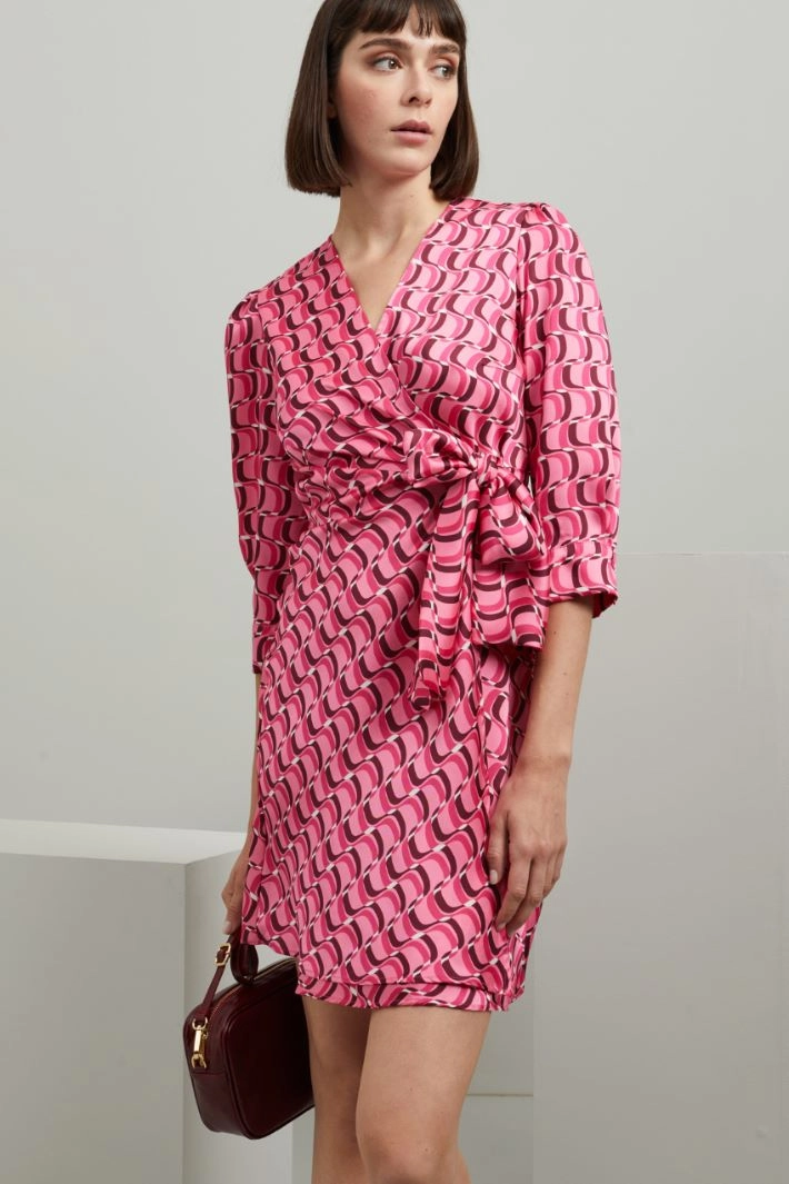 Abito corto a portafoglio realizzato in twill stampato, con scollo a V incrociato, maniche tre quarti leggermente a sbuffo con polsino e bottoni, allacciatura tramite fusciacca da annodare in vita.