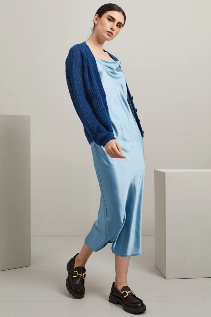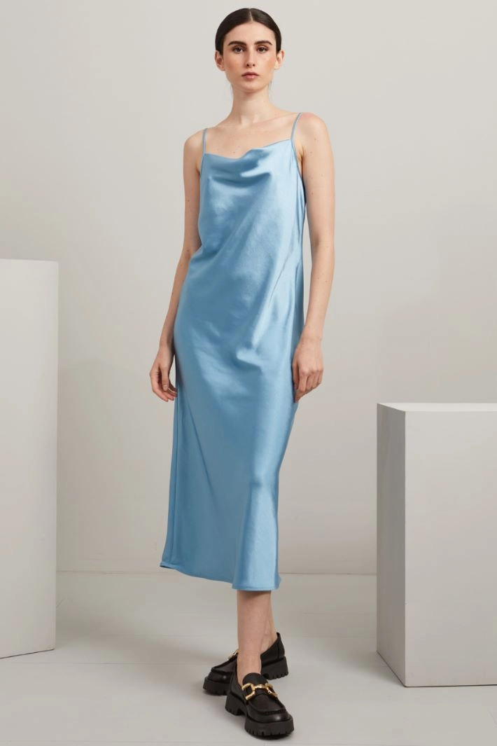 Slip dress dalla linea dritta realizzato in raso, con spalline sottili e scollo a U drappeggiato.