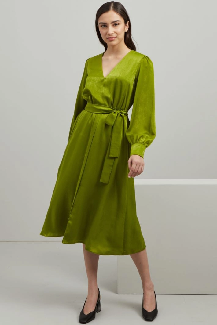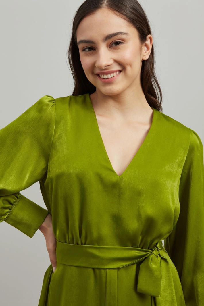 Abito dalla linea svasata realizzato in raso con scollo a V, taglio in vita e inserto elastico nel retro, maniche lunghe con polsino e bottoni rivestiti. Cintura coordinata e capo foderato.