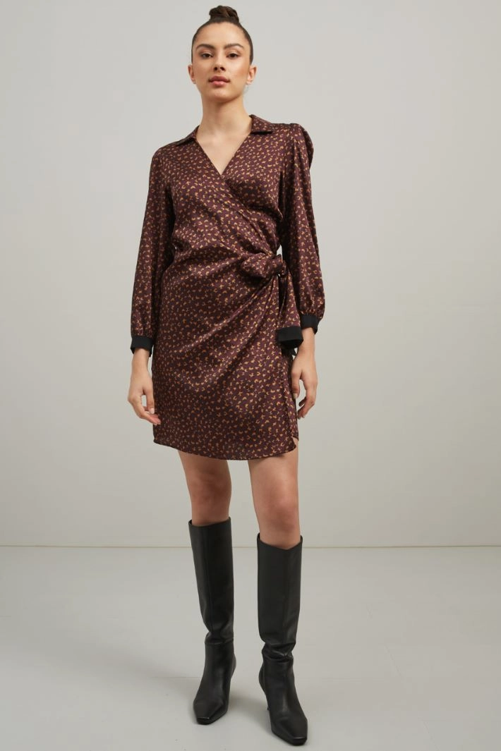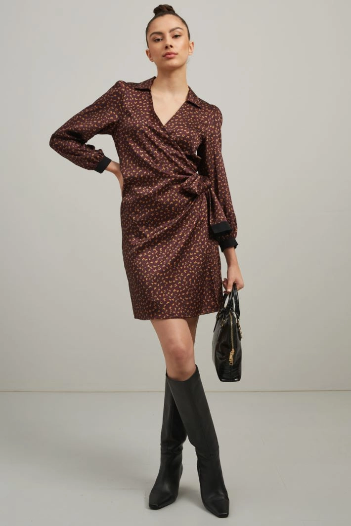 Abito a portafoglio realizzato in twill stampato con particolari in cady, collo a camicia e scollo V incrociato, maniche lunghe con polsino e bottone. Allacciatura tramite nastri da annodare in vita.