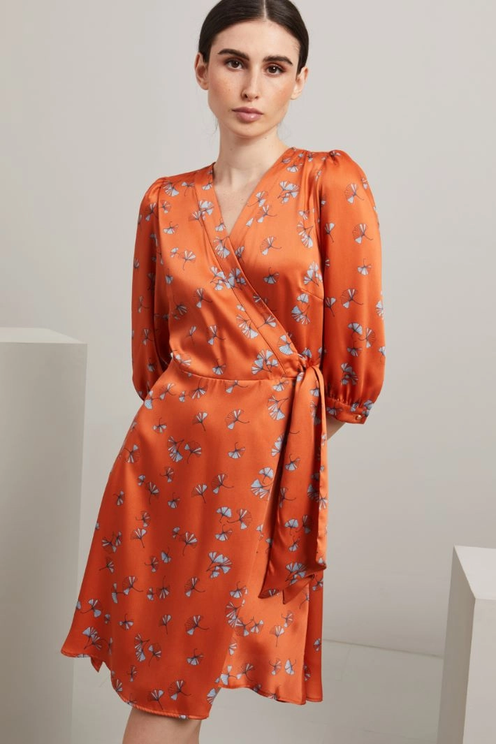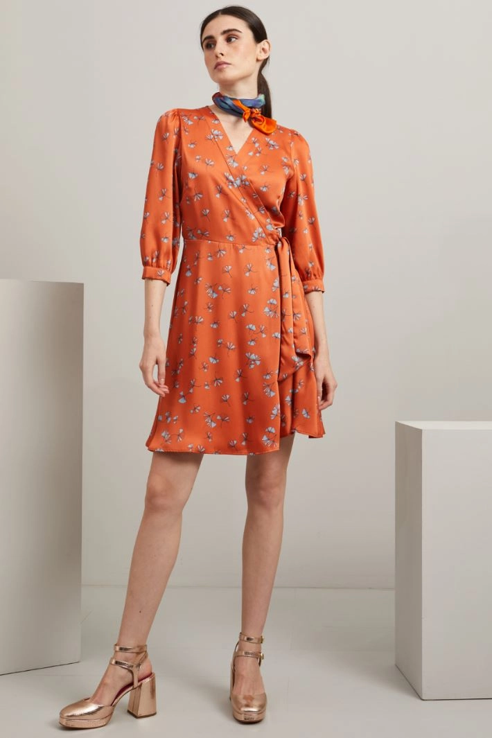 Abito corto a portafoglio realizzato in twill stampato, con scollo a V incrociato, maniche a tre quarti con polsino e bottone. Allacciatura tramite nastri da annodare sul fianco.