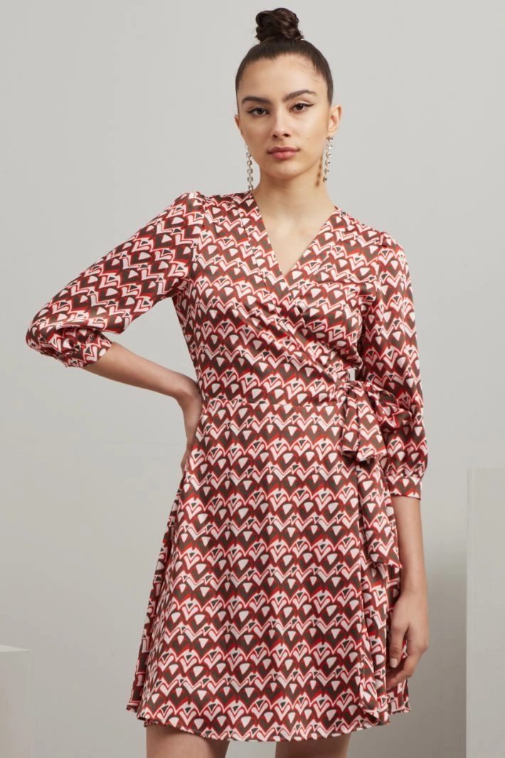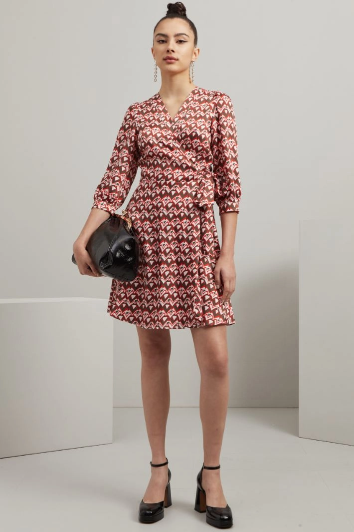 Abito corto a portafoglio realizzato in twill stampato, con scollo a V incrociato, maniche a tre quarti con polsino e bottone. Allacciatura tramite nastri da annodare sul fianco.