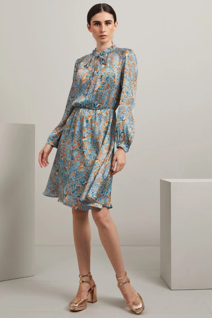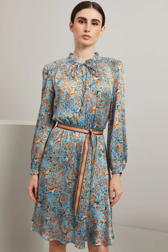Abito corto dalla linea fluida realizzato in creponne stampato, con scollo a V rifinito da rouches e laccetti da annodare, maniche lunghe con polsino e bottone, inserto elastico in vita e sulle spalle. Capo dotato di cintura coordinata. Semifoderato.