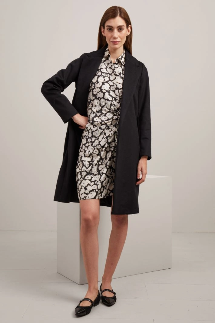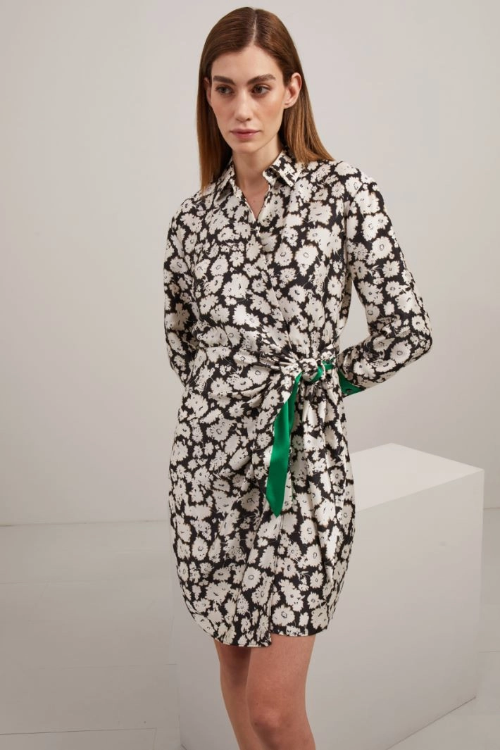 Abito a portafoglio realizzato in twill stampato, con collo a camicia, maniche lunghe con polsino e bottoni sul fondo. Allacciatura tramite nastri da legare in vita. Sfoderato.