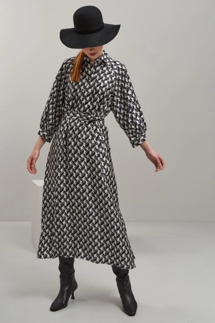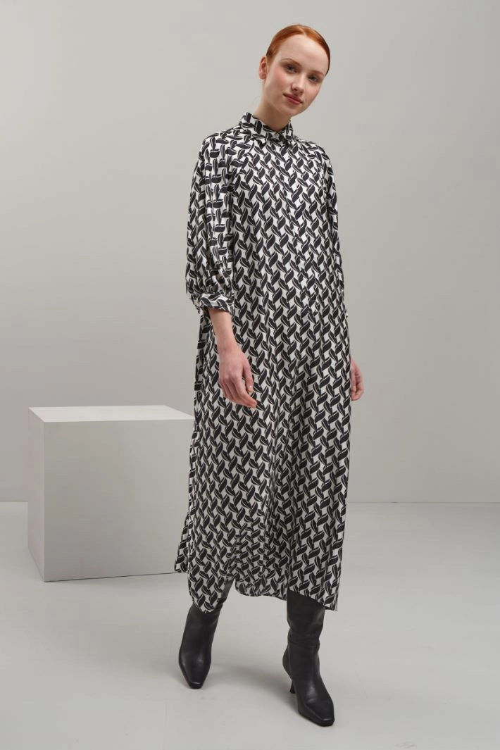 Chemisier lungo dalla linea fluida realizzato in twill di pura seta stampata, con colletto classico, maniche tre quarti raglan con polsino e bottone, tasche laterali inserite in cucitura. Allacciatura nascosta tramite bottoni e cintura coordinata.