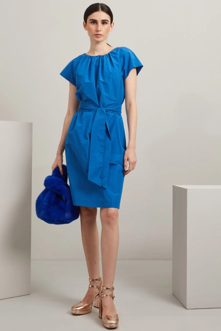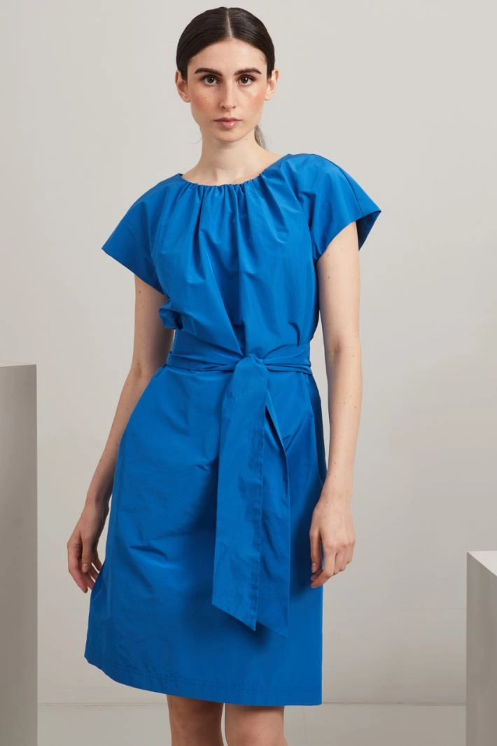 Abito corto dalla linea dritta realizzato in taffetà di misto cotone. Il modello ha scollo a giro con motivo arricciato sul davanti, maniche corte a kimono, tasche inserite in cucitura sui fianchi e allacciatura tramite zip invisibile sul retro. Capo dotato di cintura coordinata. Foderato.