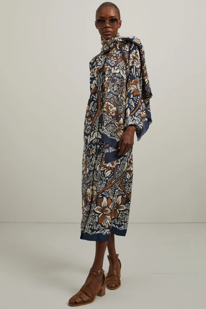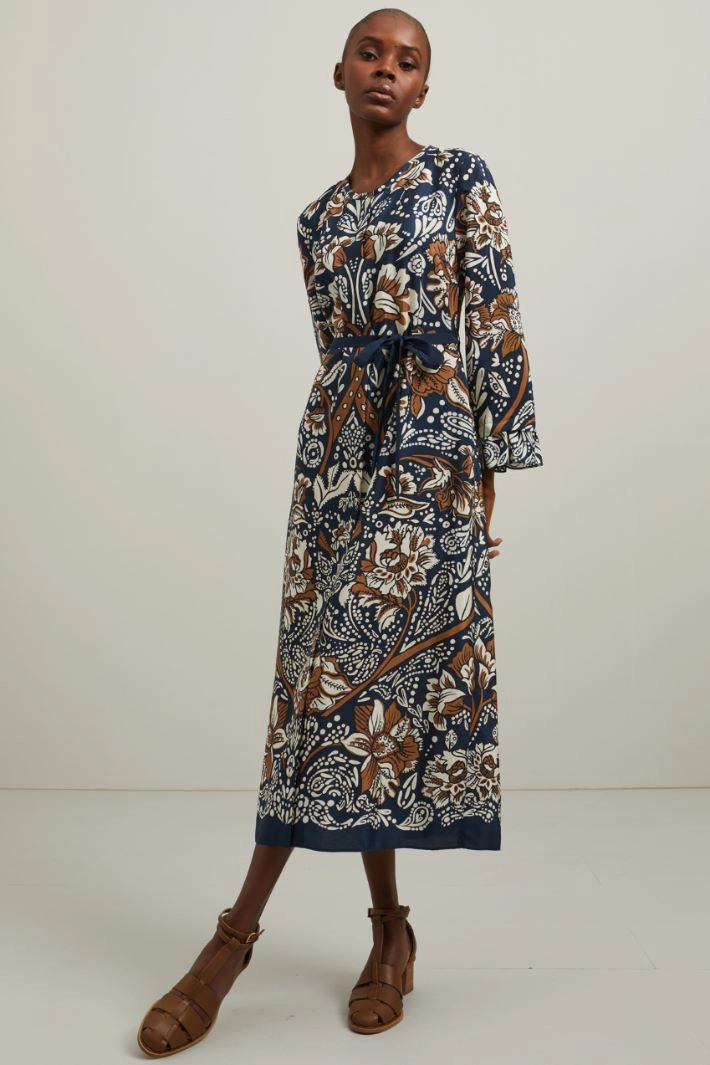Abito dalla linea fluida realizzato in raso di pura seta stampata, con scollo rotondo, maniche a tre quarti, tasche laterali inserite in cucitura. Allacciatura nascosta tramite bottoni e cintura coordinata.