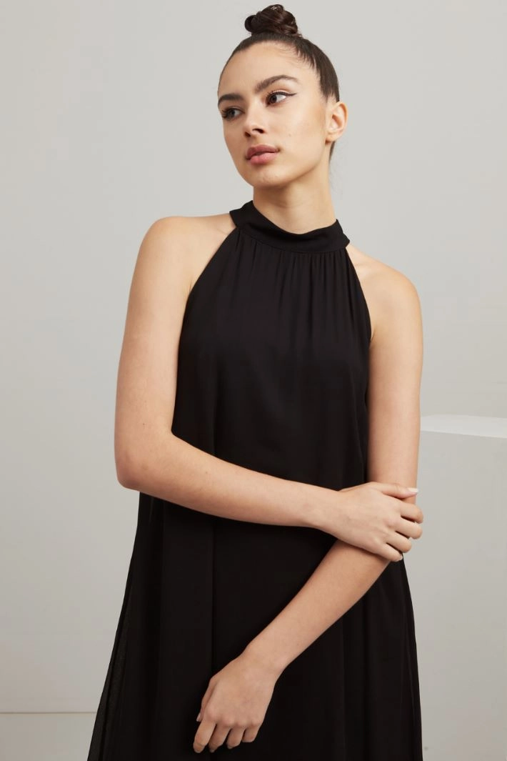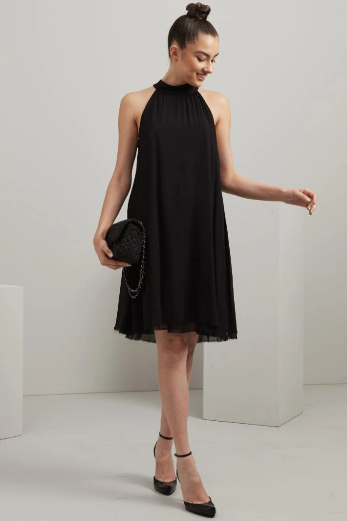 Abito corto dalla linea svasata realizzato in georgette di pura viscosa, scollo all'americana con nastri da annodare nel retro. Foderato.