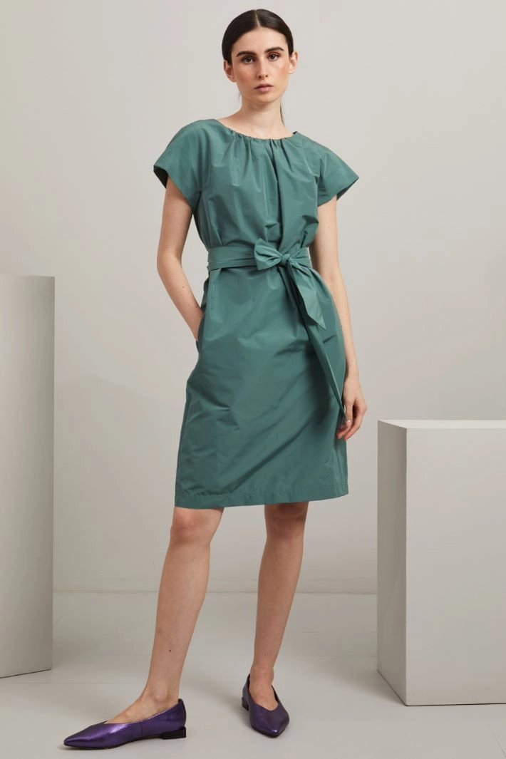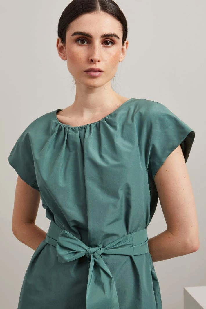 Abito corto dalla linea dritta realizzato in taffetà di misto cotone. Il modello ha scollo a giro con motivo arricciato sul davanti, maniche corte a kimono, tasche inserite in cucitura sui fianchi e allacciatura tramite zip invisibile sul retro. Capo dotato di cintura coordinata. Foderato.