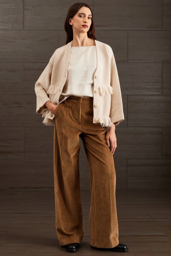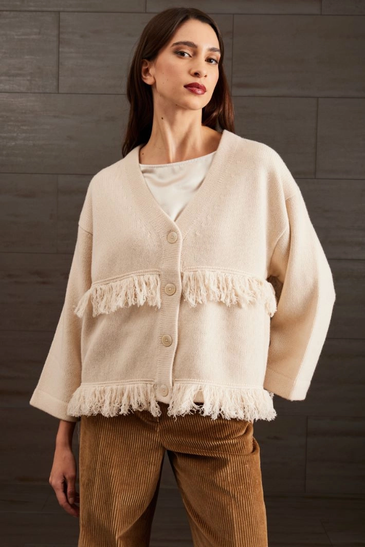 Cardigan dalla linea dritta realizzato in filato di pura lana, con scollo a V e maniche lunghe dal giro sceso e motivo di frange. Allacciatura tramite bottoni a vista.
