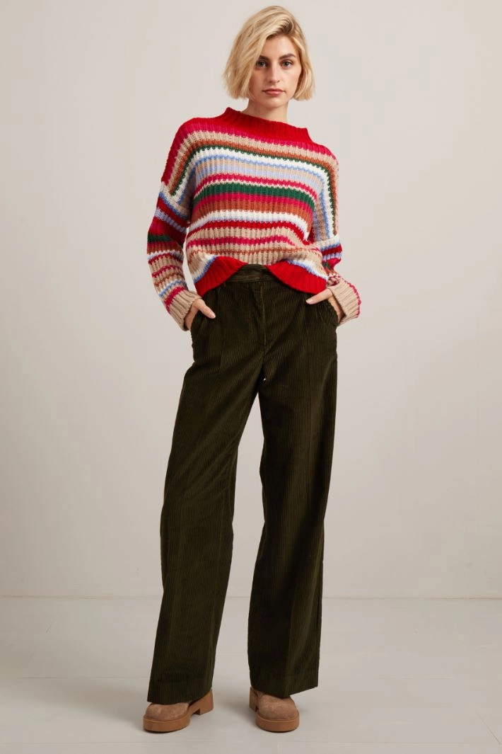 Maglia corta dalla linea morbida realizzata in filato di pura lana tinto filo, con scollo rotondo, maniche lunghe dal giro sceso e profili rifiniti a coste.