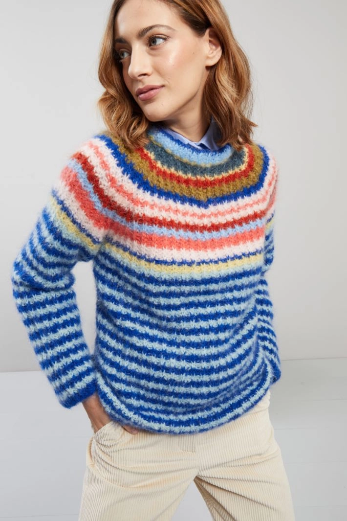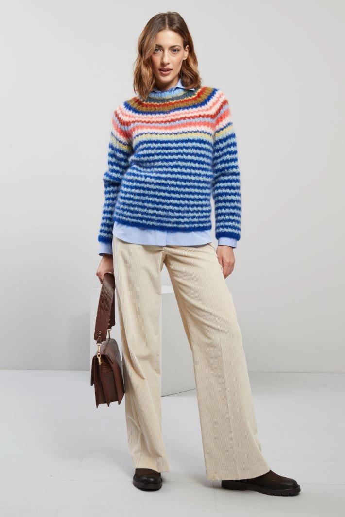 Maglia dalla linea dritta realizzata in filato di misto mohair tinto filo, con collo montante e maniche lunghe.