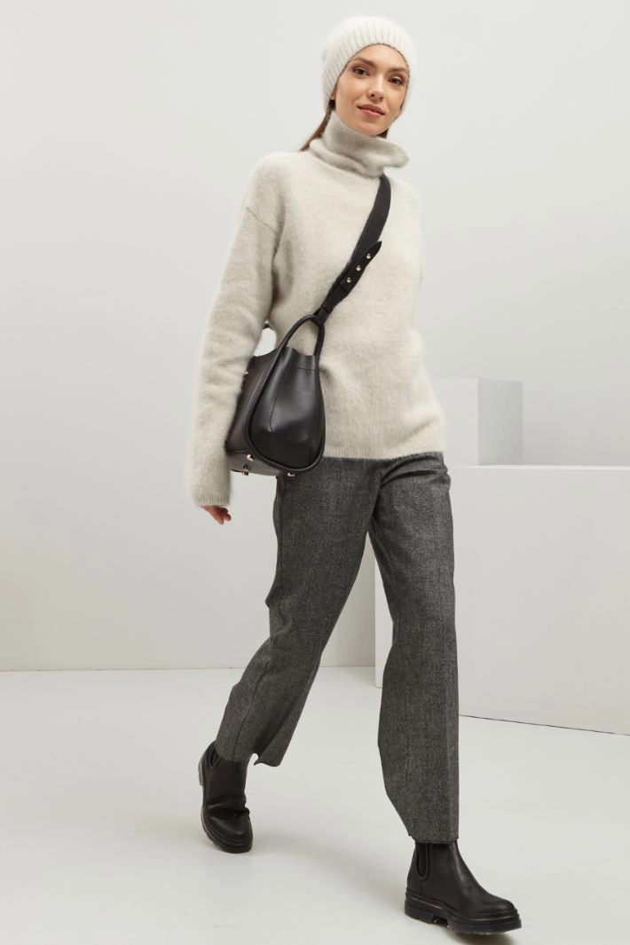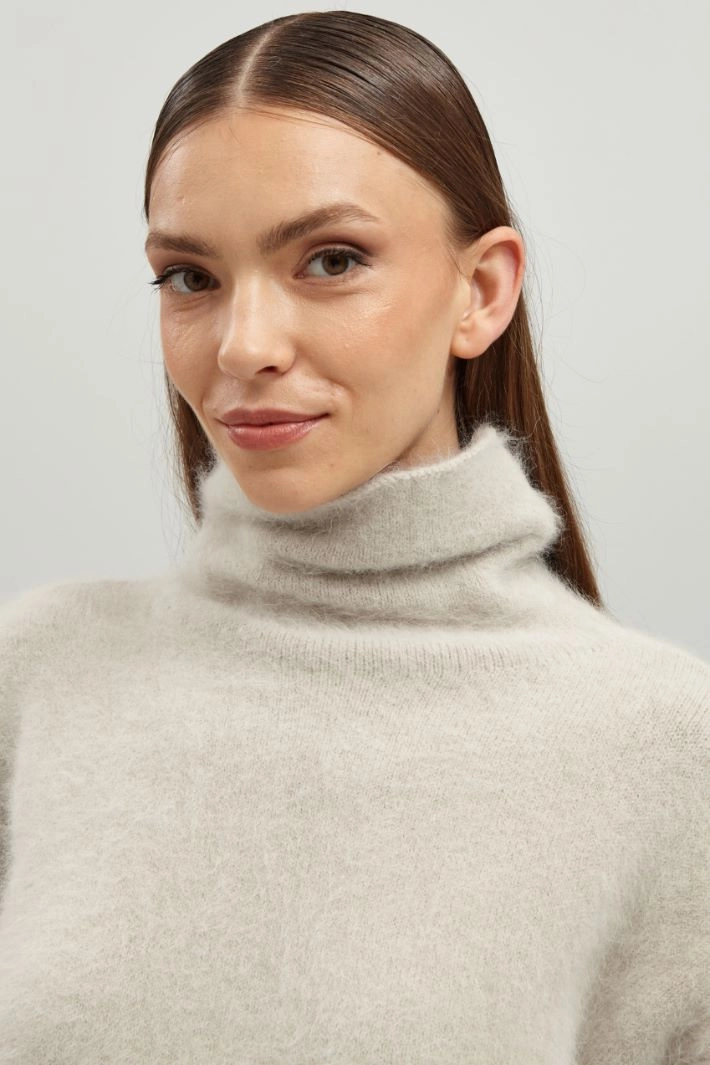 Maglia dalla linea morbida realizzata in filato di misto angora con collo alto e maniche lunghe dal giro sceso.