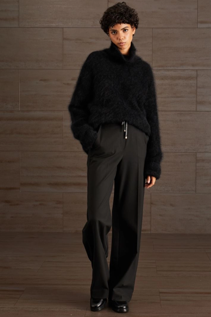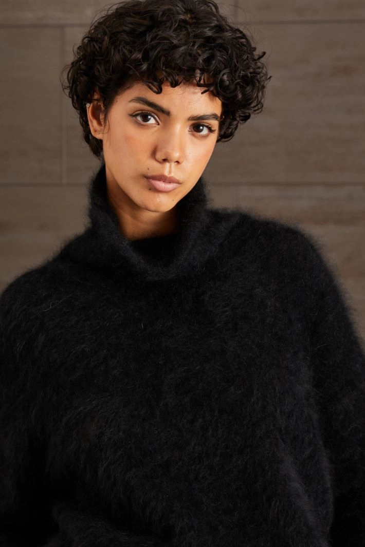 Maglia dalla linea morbida realizzata in filato di misto angora con collo alto e maniche lunghe dal giro sceso.