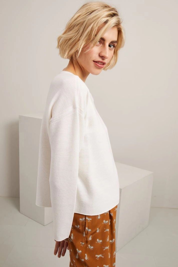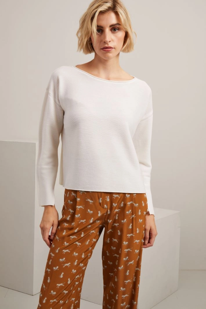 Maglia dalla linea dritta realizzata in filato di pura lana con scollo a barchetta e maniche lunghe dal giro sceso.