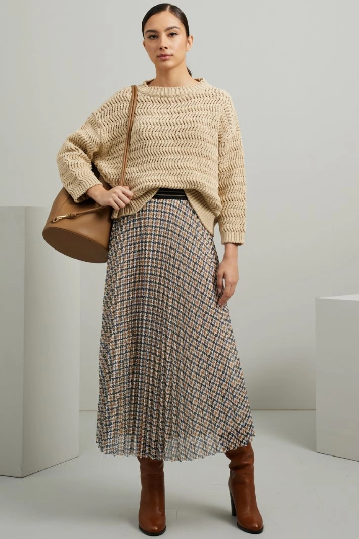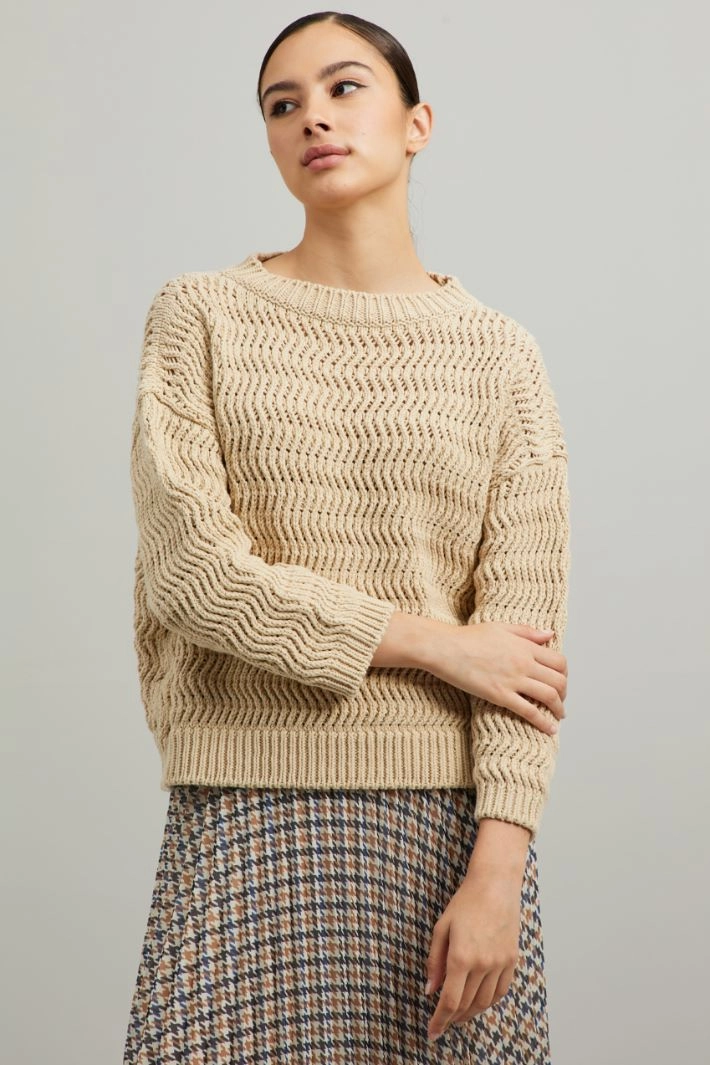 Maglia dalla linea dritta realizzata in filato di misto cotone, con motivo a rilievo traforato, scollo a giro, maniche lunghe dal giro sceso e profili rifiniti a coste.