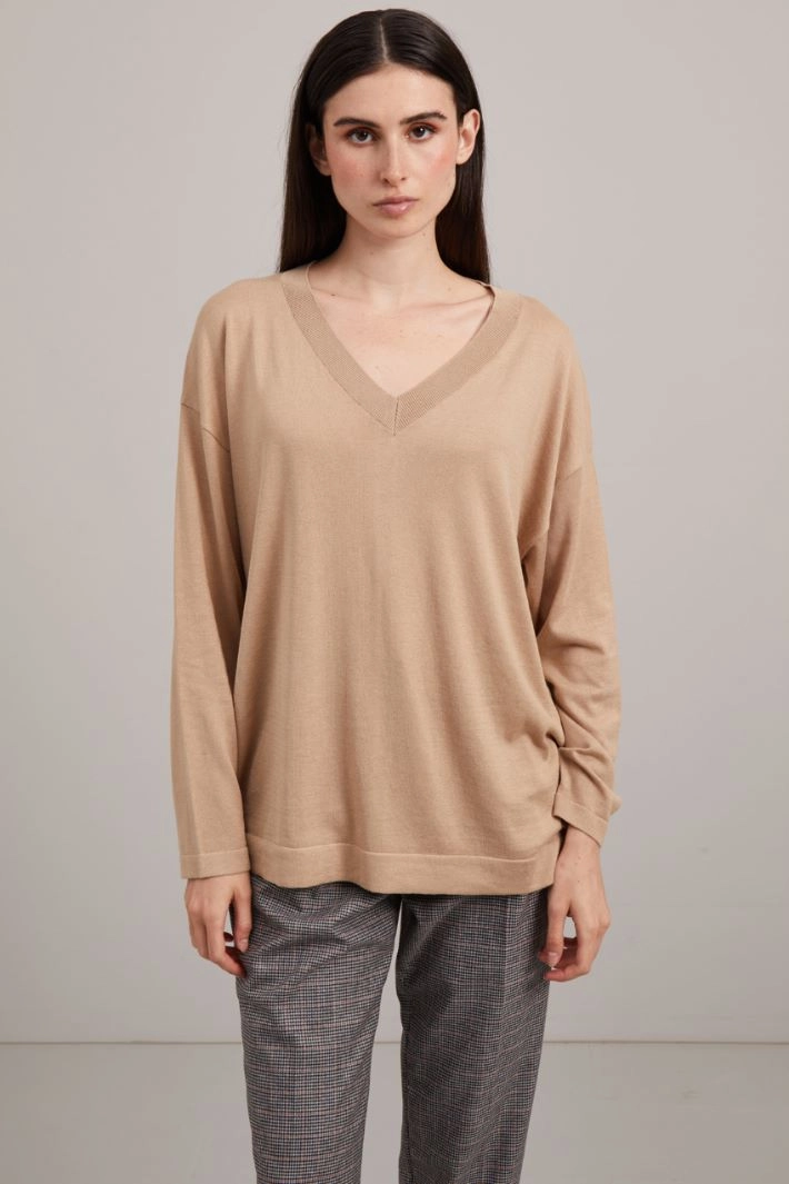 Maglia dalla linea morbida realizzata in filato di cotone e seta. Il modello ha scollo a V, maniche lunghe e profili rifiniti a coste.