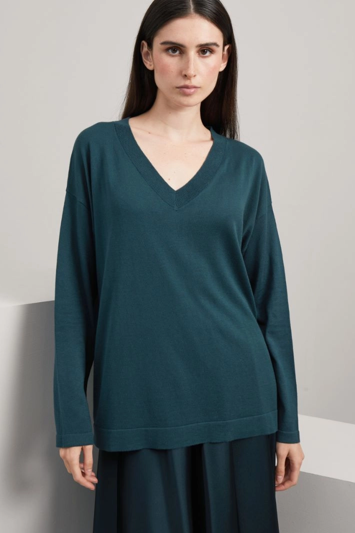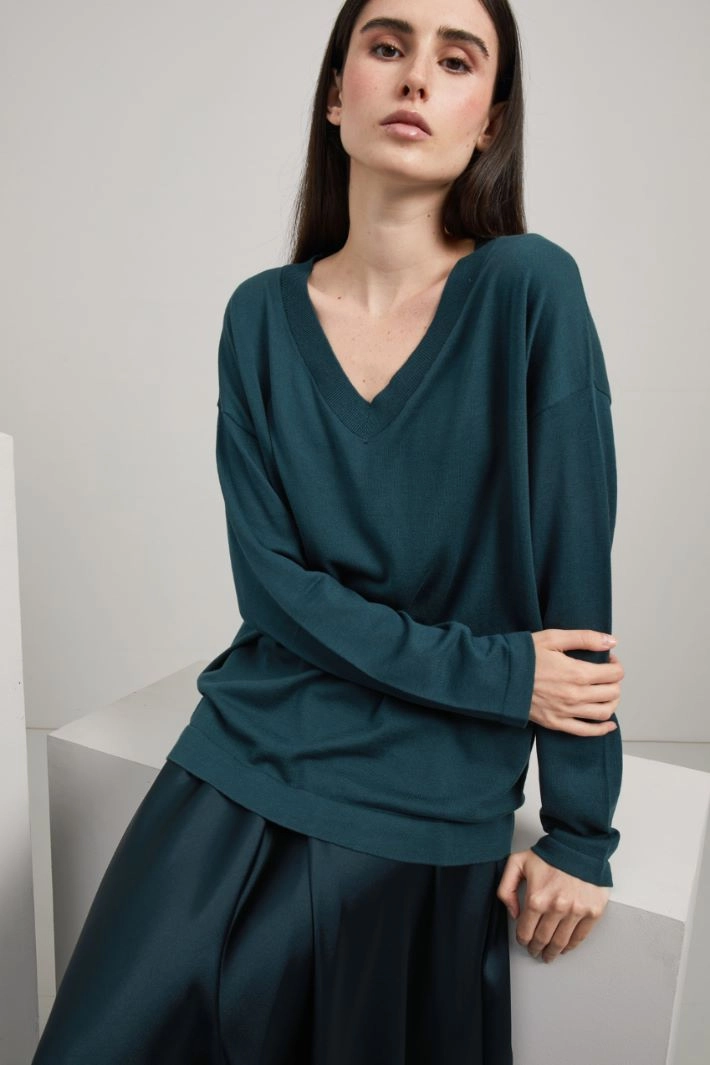 Maglia dalla linea morbida realizzata in filato di cotone e seta. Il modello ha scollo a V, maniche lunghe e profili rifiniti a coste.