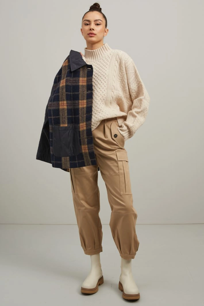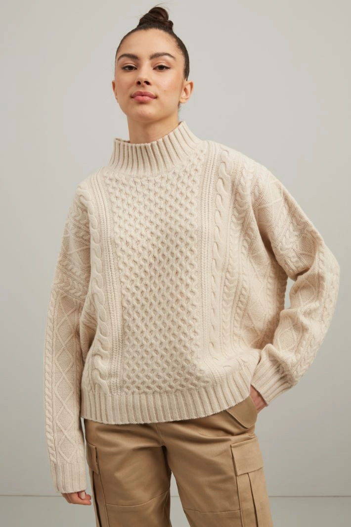 Maglia dalla linea dritta realizzata in filato di pura lana, con collo a cratere e maniche dal giro sceso, profili rifiniti a coste.