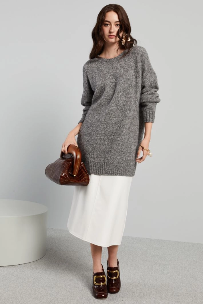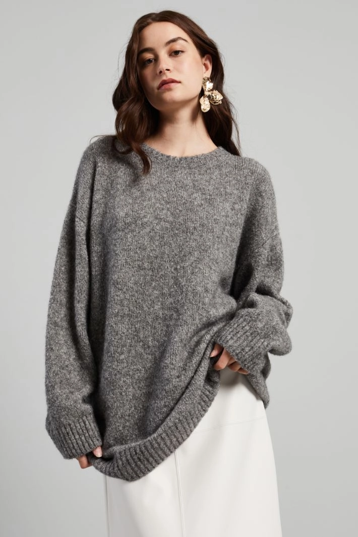Maglia dalla linea over realizzata in filato melange di misto alpaca e cotone stretch con scollo a barchetta, maniche lunghe dal giro sceso e profili rifiniti a coste.