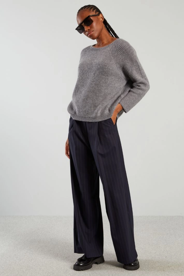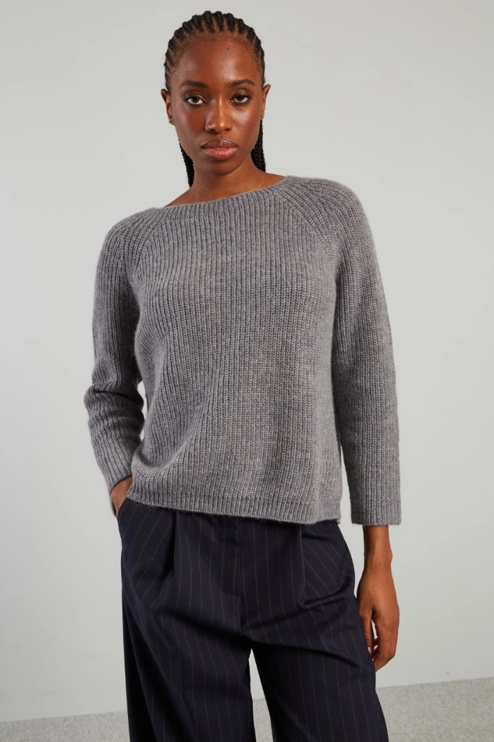 Maglia dalla linea morbida realizzata in filato di misto mohair a coste, con scollo rotondo e maniche lunghe raglan.
