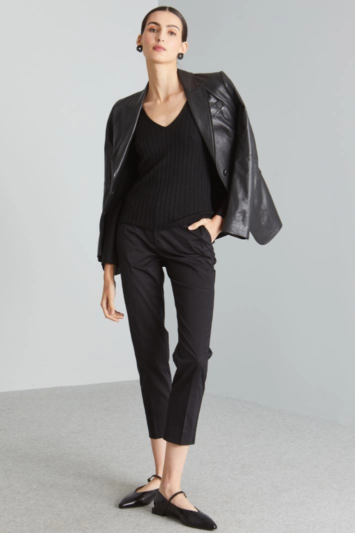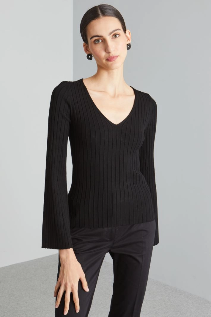 Maglia dalla linea aderente realizzata in filato di misto viscosa, con lavorazione a coste piatte, scollo a V e maniche lunghe.