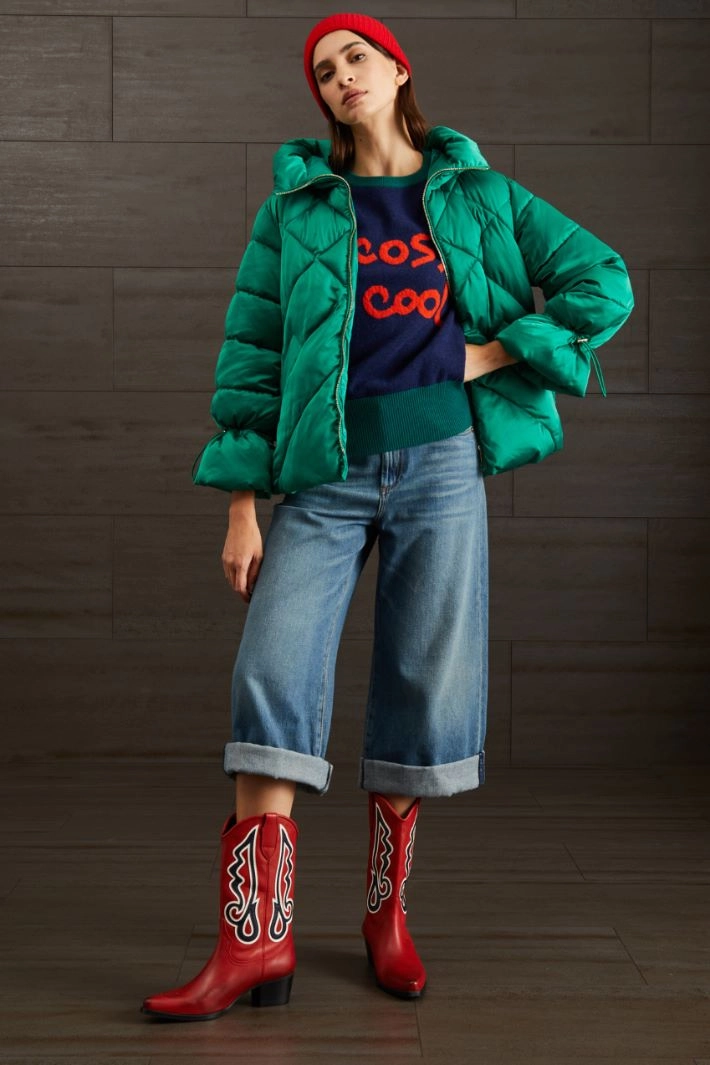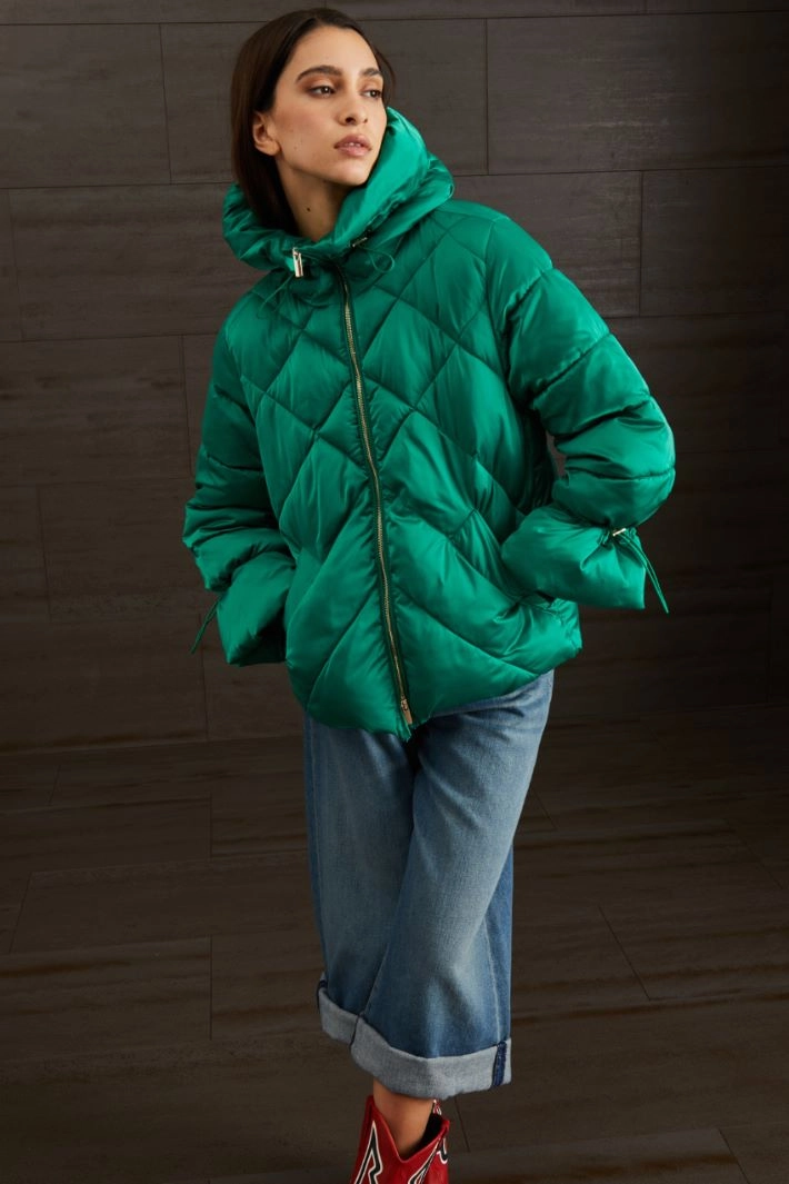 Imbottito corto dalla linea ad uovo realizzato in raso tecnico antigoccia trapuntato, cappuccio, coulisse al collo, maniche lunghe con inserto elastico al polso, tasche a filettone. Allacciatura tramite zip.