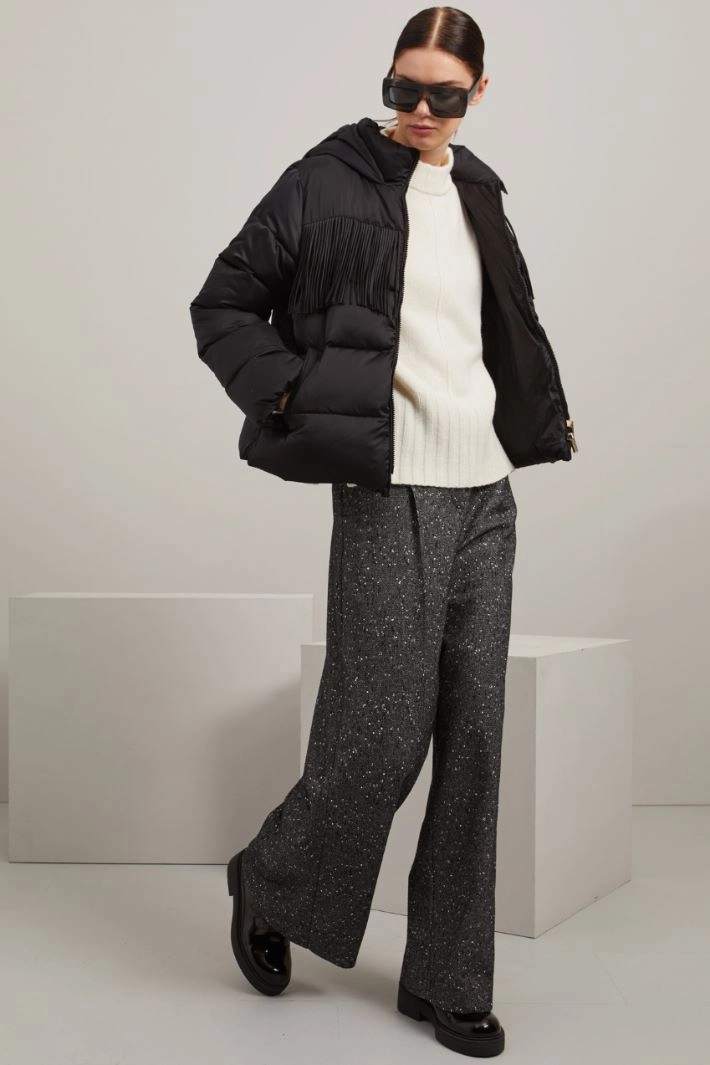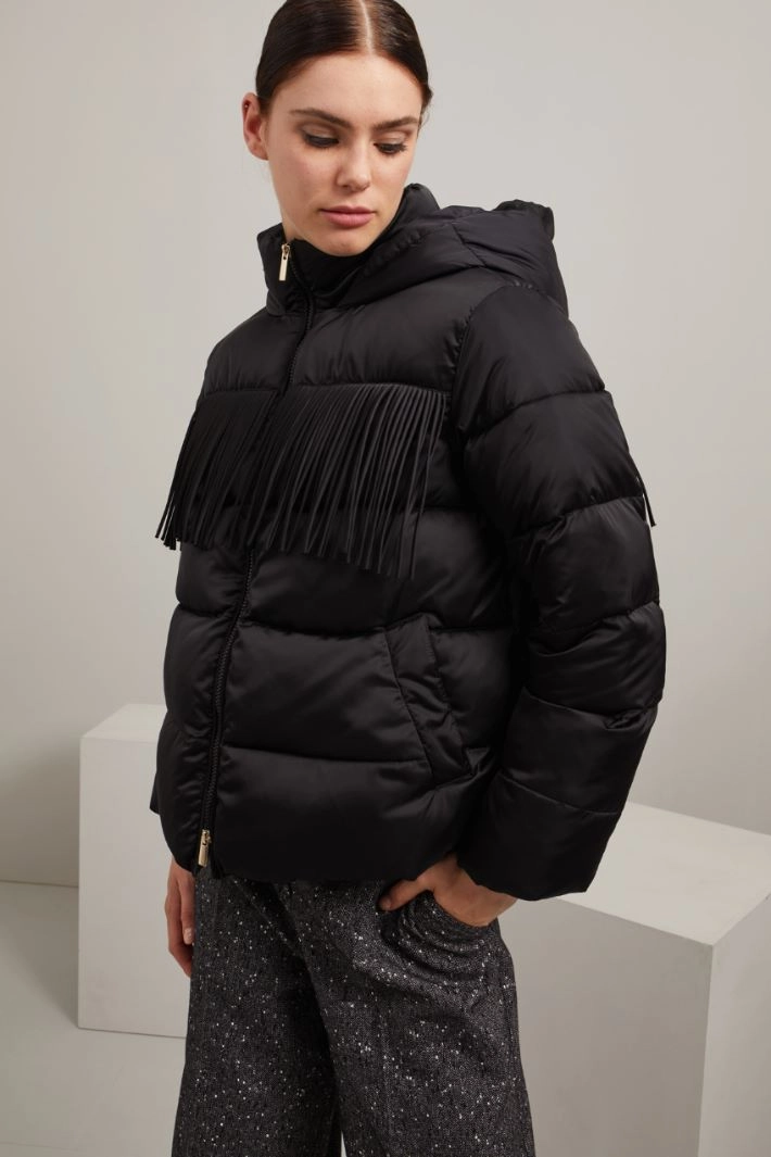 Imbottito corto realizzato in raso tecnico trapuntato con collo alto, cappuccio, maniche lunghe con inserto elastico al fondo, tasche laterali a filettone, dettaglio di frange sul davanti e allacciatura tramite zip a doppio cursore.