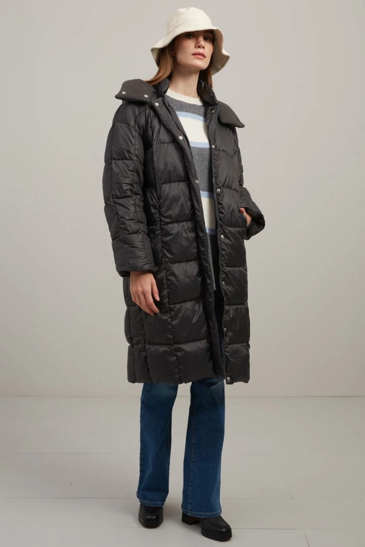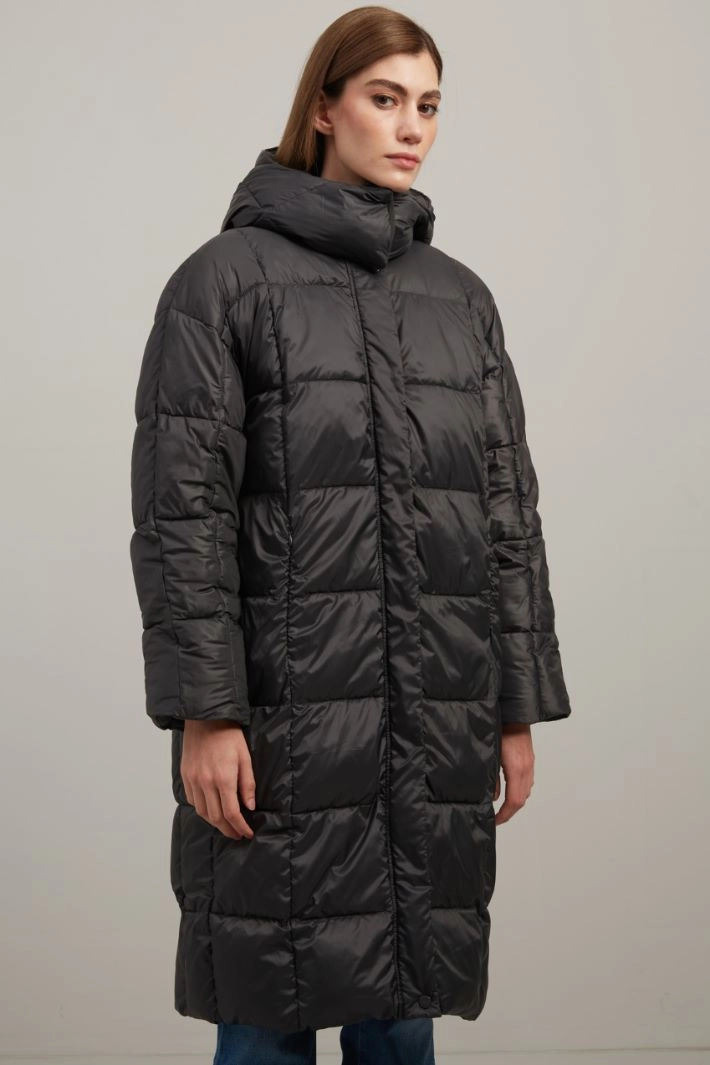 Imbottito lungo dalla linea dritta realizzato in raso tecnico antigoccia trapuntato, collo con cappuccio rimovibile, maniche lunghe a kimono, tasche inserite in cucitura con zip. Allacciatura nascosta tramite zip e bottoni a pressione.