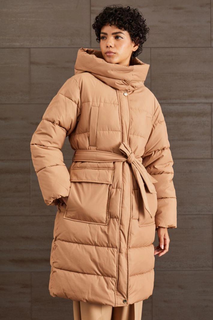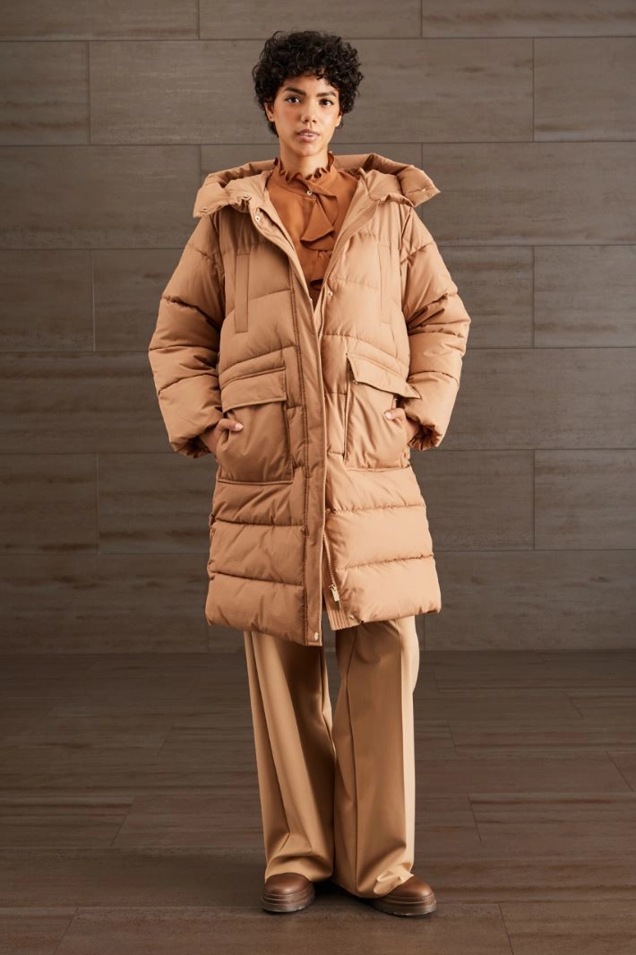 Imbottito lungo dalla linea dritta realizzato in tessuto opaco antigoccia trapuntato, con cappuccio e collo alto, maniche lunghe, taschini a filettone e tasche a filetto con patta, passanti in vita. Allacciatura monopetto nascosta tramite zip e bottoni. Capo dotato di cintura coordinata.