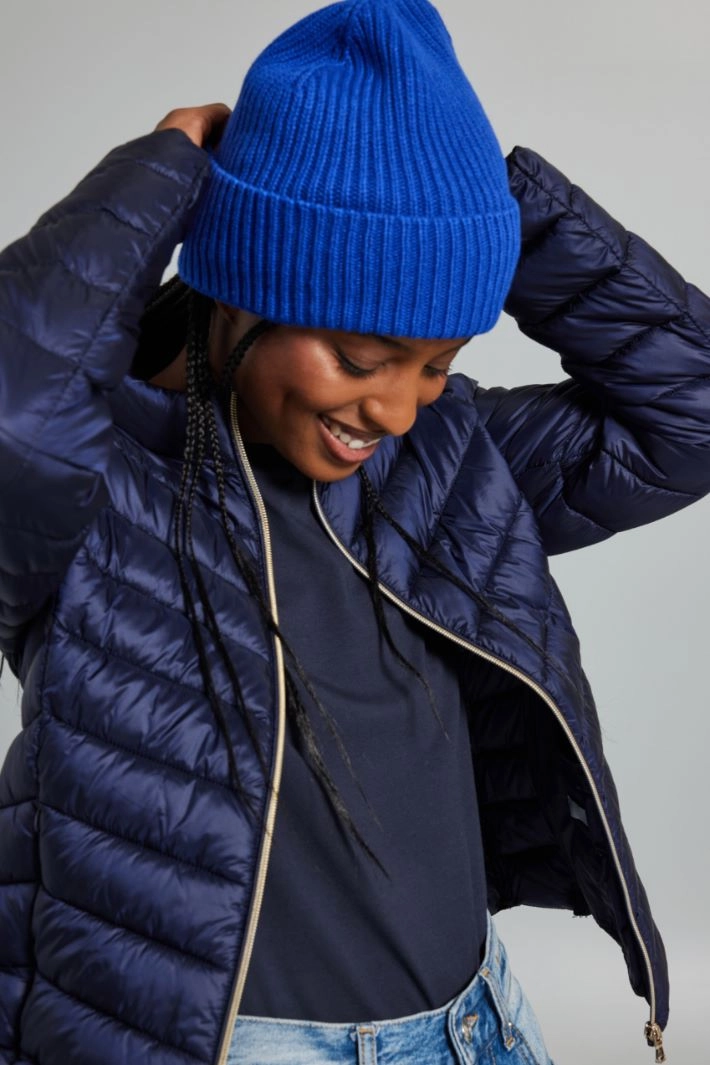 Cuffia realizzata in filato di lana, viscosa e cashmere, con lavorazione a coste e fondo risvoltato.